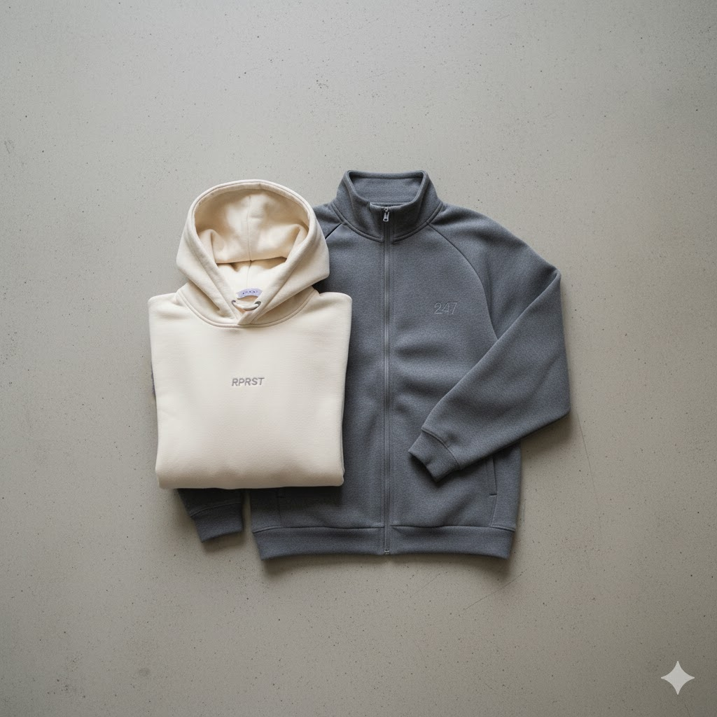 A puffer jacket or a light shell from the brand sits closer to the body. A hoodie sits wider around the shoulders and chest. Many people wear both together. The hoodie adds warmth under the jacket without feeling too bulky.